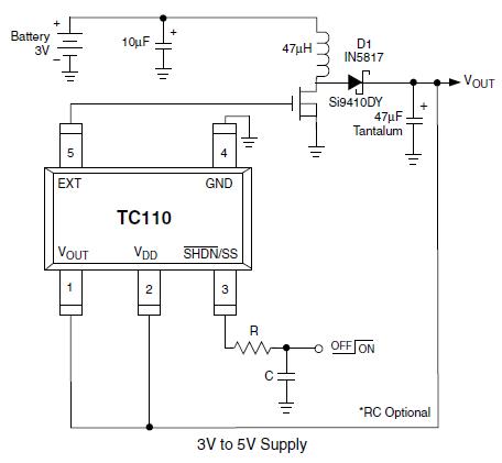 The TC110303ECTTR is a step-up (Boost) switching controller that furnishes output currents of up to 300mA while delivering a typical efficiency of 84%. The TC110303ECTTR normally operates in pulse width modulation mode (PWM), but automatically switches to pulse frequency modulation (PFM) at low output loads for greater efficiency. Supply current draw for the 100kHz version is typically only 50μA, and is reduced to less than 0.5μA when the SHDN input is brought low. Regulator operation is suspended during shutdown. The TC110303ECTTR accepts input voltages from 2.0V to 10.0V, with a guaranteed start-up voltage of 0.9V.The applications of the TC110303ECTTR include palmtops, battery-operated systems, positive LCD bias generators, portable communicators.
